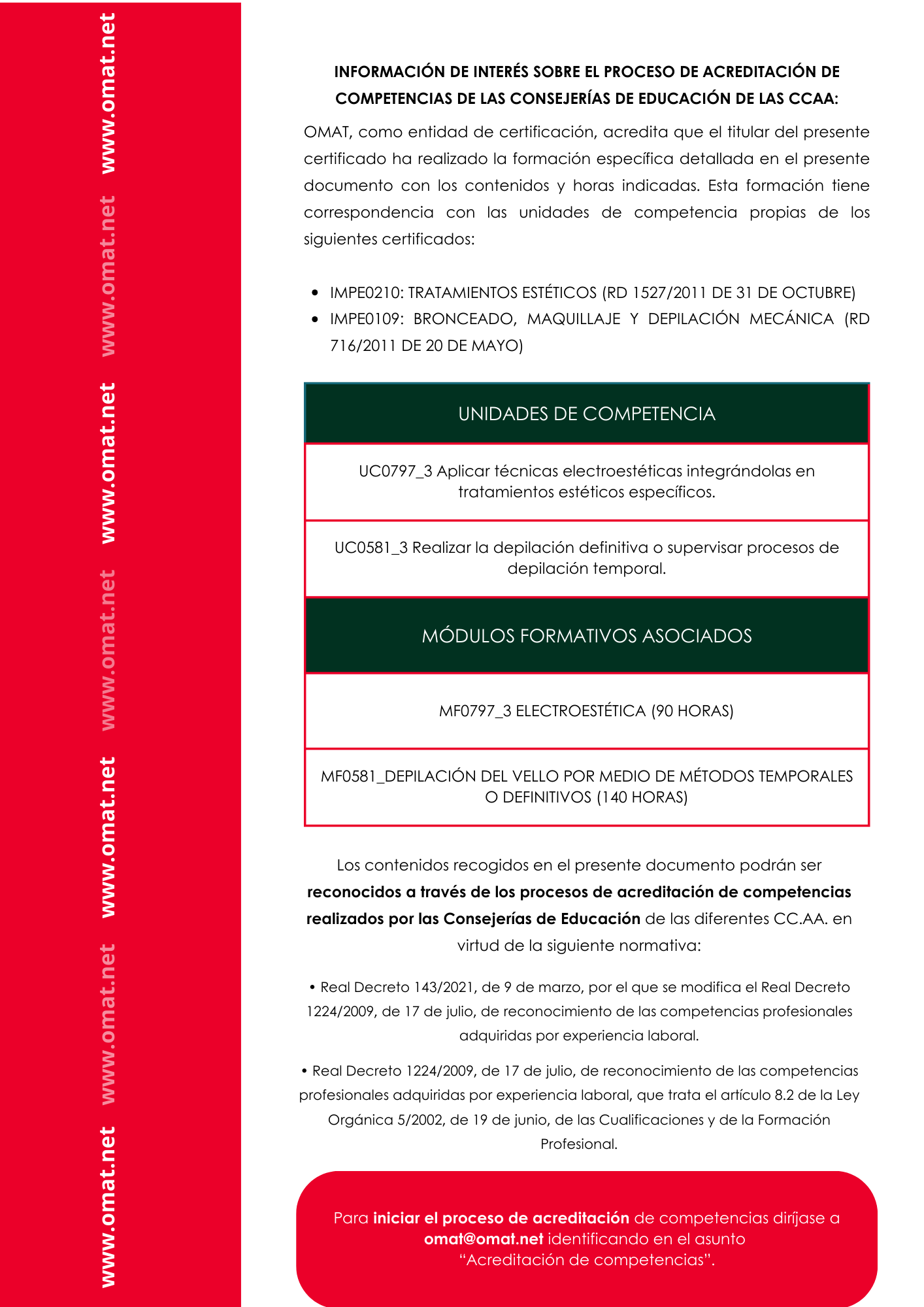 - Iniciar el proceso de acreditación de competencias ante las consejerías de educación de las diferentes CCAA, dado que se ajusta a los criterios establecidos por el Real Decreto 1224/2009, de 17 de julio, de reconocimiento de las competencias profesionales adquiridas por experiencia laboral y formación no formal e informal, para conseguir un certificado de profesionalidad oficial del estado español.